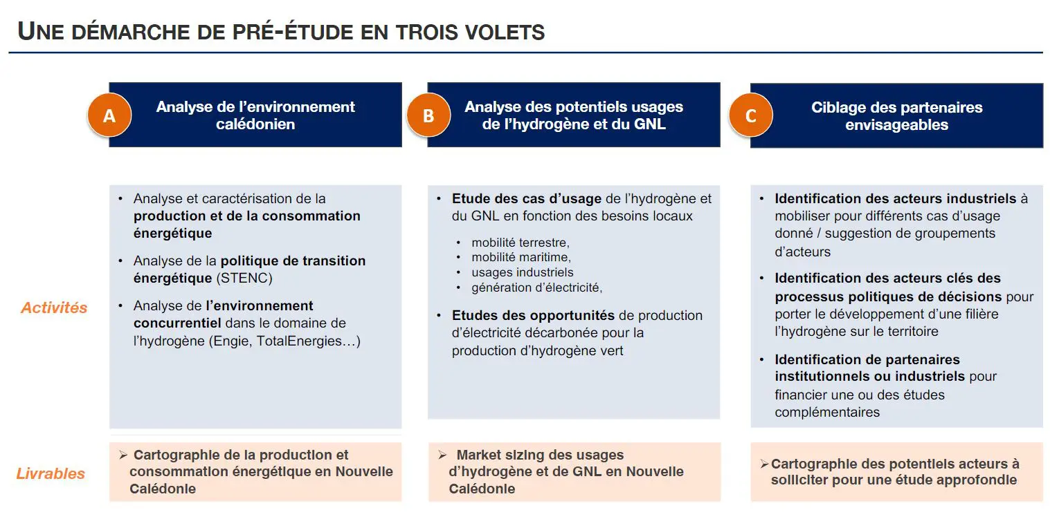 Enfin, menée avec l’expertise d’Antheus Advisor, l’Agence Calédonienne de l’Énergie a présenté sa pré-étude d’ingénierie pour le développement d’une activité hydrogène en Nouvelle-Calédonie. La démarche de cette pré-étude repose sur trois volets (voir image ci-dessous) et fixe les prochaines étapes identifiées pour le développement d’une filière sur le territoire.